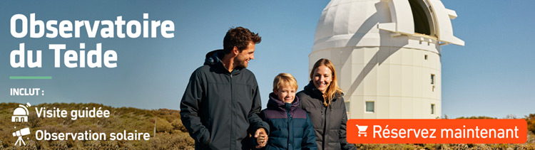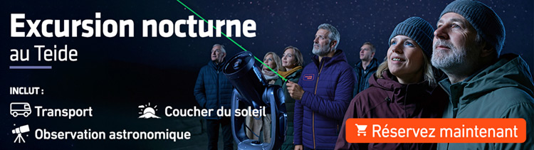 Pour ceux qui préfèrent rester un peu plus longtemps sur le Teide et profiter de l’observation des étoiles depuis ce site mondialement privilégié, l’excursion « Coucher de soleil et ciel étoilé au Teide » associe l’accès au téléphérique pour voir le coucher du soleil et une observation des étoiles, plus tard, avec des télescopes et encadrée par des professionnels.